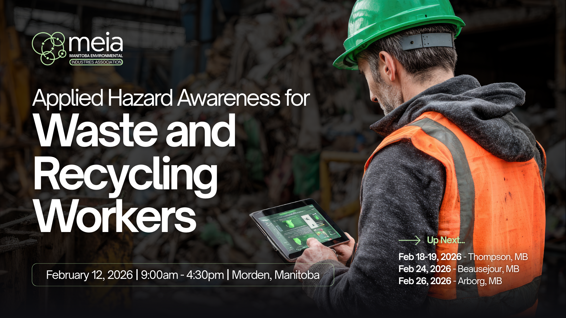 In collaboration with the Manitoba Construction Sector Council, Supply Chain Manitoba, the Manitoba Trucking Association, and the Manitoba Association of Regional Recyclers, MEIA is pleased to offer this training specifically developed for workers and supervisors employed at community and regional waste disposal grounds, waste transfer stations as well as Eco-Centers and Recycling Depots.